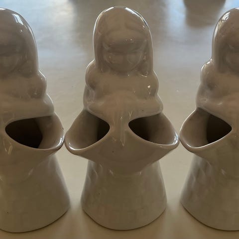 Smukke håndmalede figurer i keramik forestillende kvinder i traditionelle dragter. Fine detaljer i ansigt og mønster samt varme jordfarver i kjolerne. Perfekte som pynt i reol, vitrineskab eller til samleren af retro interiør.