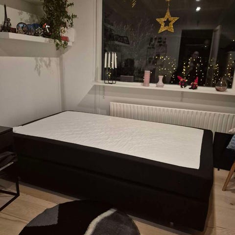 Jysk seng med ben. Rammemadras med mørkt stofbetræk og lyse metalben. Velegnet som enkeltseng i soveværelse, gæsteværelse eller ungdomsværelse.