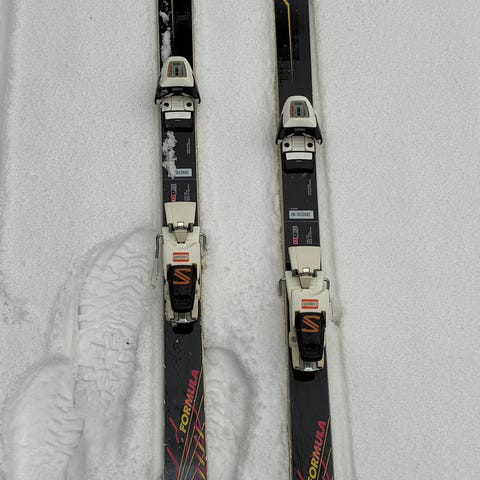 Scott xs Sportsster ski med bindinger. Alpinski med integrerede bindinger, velegnet til pistekørsel. Farverne er primært sort, hvid og gul. Sælges sammen med et sæt skistave som vist på billederne.