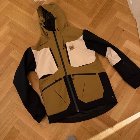 Master jakke i størrelse 38. Jakken er fremstillet i 100 % polyester og er rød med mørkt inderfor. Aftagelig hætte og flere lynlåslommer.