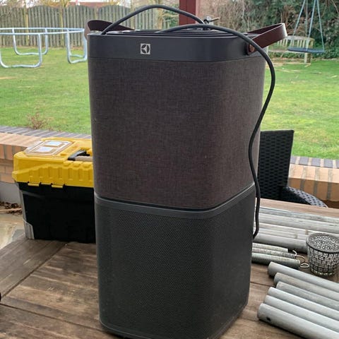Electrolux AF71 luftrenser i grå tekstilfront og mørk kabinet. Enheden har bærehåndtag på toppen og kan indstilles mellem manuel og smart tilstand via betjeningspanelet. Bagsiden er udstyret med udskifteligt filtermodul, som kan tages af for rengøring eller filterskift. Luftrenseren er egnet til indendørs brug og tilsluttes med ledning til almindelig stikkontakt. Anvendt få gange.