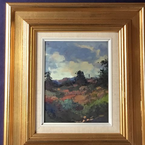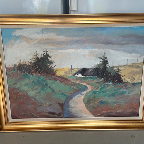 Knud Bøstrup maleri med landskabsmotiv, der viser en vej mellem bygninger i et landligt miljø. Maleriet er udført i dæmpede, naturlige farver og er monteret i en dekoreret guldfarvet ramme med ophæng på bagsiden. På bagsiden sidder en etiket med oplysninger om maleren Knud Bøstrup. Velegnet til ophængning i stue, gang eller lignende rum.