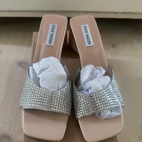 Steve Madden festsko med hæl i størrelse 39. Skoene har firkantet snude og høj stilethæl. Overdelen består af brede, flettede remme med dekorative rhinsten. Indersål og hælkappe er i en glat, lys brun tone. Ydersålen er glat med let firkantet form ved forfoden. Velegnet som fest- og selskabssko. Aldrig brugt, kun prøvet på indenfor.