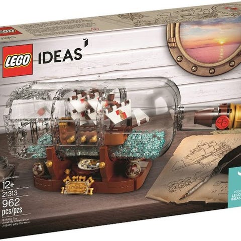 LEGO Ideas byggesæt med motiv af skib i flaske. Sættet består af klodser til at bygge et detaljeret skib placeret i en gennemsigtig flaske på en udstillingsstand. Egnet som samlersæt eller udstillingsmodel. LEGO Ideas-serien er baseret på fan-designs og henvender sig primært til ældre børn, unge og voksne, der ønsker et mere avanceret byggesæt.
