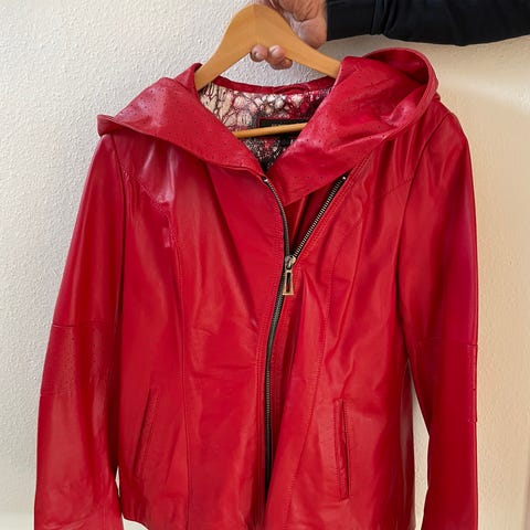 Hvid læderjakke i 100 % ægte læder med ægte pelskant på hætten, kun brugt få gange, 4 lommer foran, lynlås og trykknapper fungerer, ribkant ved talje og manchetter. Jakken er ren og velholdt fra røgfrit hjem.