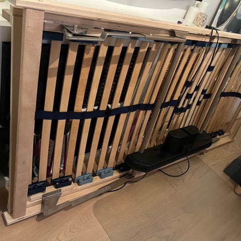elevationsbund og lamelbund til seng. Sengen består af to separate lamelbunde i træ med elektrisk elevation, som styres via medfølgende håndbetjening. Bunden er opbygget af fleksible lameller med justerbare zoner. Rammen er i lyst træ med grå ben. Der medfølger to madrasser, der passer til elevationsbunden. Velegnet som dobbeltseng med individuel regulering i hver side.