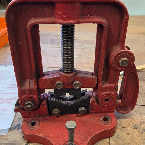 Virax rørskruestik på stativ i rødmalet metal. Skruestikken er beregnet til fastspænding af rør ved arbejde som skæring, gevindskæring eller tilpasning. Den har gevindspindel med håndtag til justering og fastspænding samt riflede kæber til at holde rørene på plads. Monteret på trefodsstativ, som giver stabil arbejdsposition på gulv. Velegnet til værksted eller byggeplads, hvor der arbejdes med rørinstallationer.