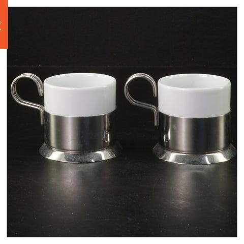 Dette sæt består af to små porcelænskopper fra Menu med et blankt stål ydre og en integreret metalhåndtag. Kopperne har en enkel, tidløs design, velegnet til varme drikke som kaffe eller te.