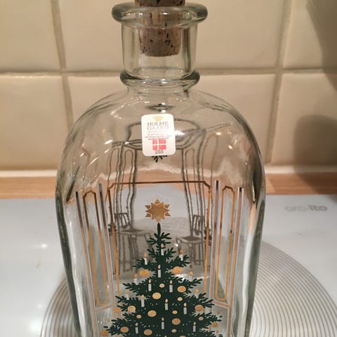 Denne flaske fra holmegaard har et juletræsmotiv på ydersiden, med dekorationer som stearinlys og gaver omkring træet. Flasken er gennemsigtig og har en korkprop. Den måler ca. 20 cm i højden. Æsken til flasken viser tegn på brug med flere skræmmer og ridser. Flasken og emballagen har temaer relateret til julen.
