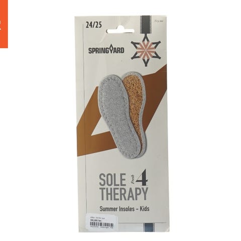 Springyard Sole Therapy summer indlægssåler til børn, størrelse 22-23 cm. Sålerne er fremstillet af bambusstof med kokosfibre for friskhed og komfort. Perfekte til at holde fødderne friske og behagelige hele dagen. Emballagen viser produktets specifikationer og materialer.
