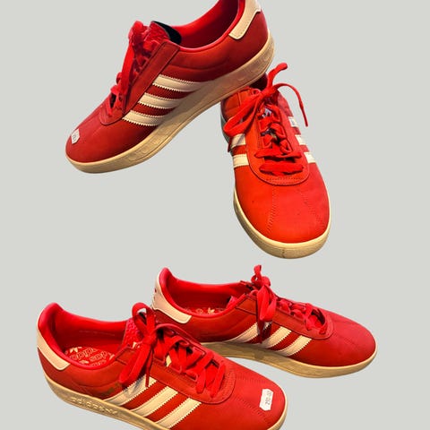 Et par brugte, hvide sneakers med sorte striber og detaljer. Skoene har slidmærker og lette forureninger rundt omkring på overfladerne. Skoens snørebånd er lidt flossede, og sålerne viser tegn på brug med let slid på mønstret.