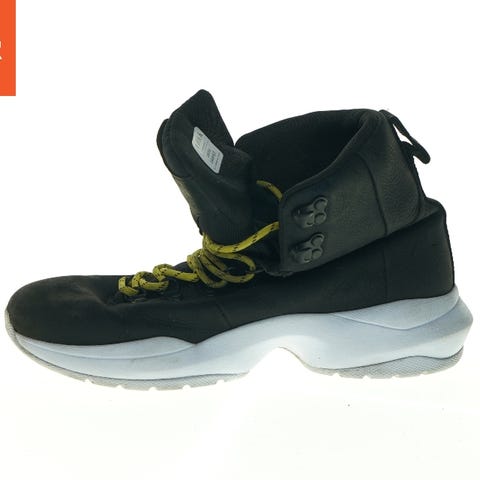Et par sorte sneakers med højt skaft og kontrasterende neongule snørebånd. Skoene har en karakteristisk tyk hvid sål med en profil, der buer op langs siden. Lukningen på skoene kombinerer snørebånd med en velcro-strop ved anklen for ekstra støtte. Materialet ser ud til at være en kombination af læder og tekstil, og den indre del er foret med sort stof. Skoene viser tegn på brug, især på den hvide sål, som er lettere beskidt.
