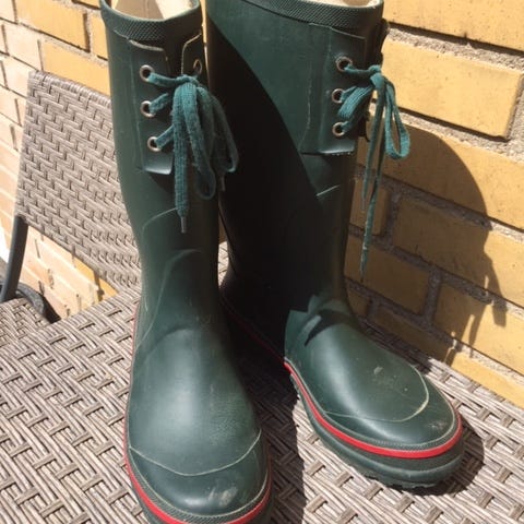 Et par brugte sorte snørestøvler i gummi med en matt overflade. Støvlerne har snørebånd gennem sølvfarvede metalknapper og en grov ydersål.