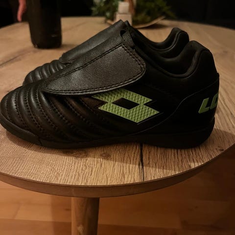 Lotto fodboldsko til indendørs brug i sort med grønne detaljer. Skoene har lukket snude med velkroluk. Ydersålen er flad med mønster, der er egnet til glatte indendørs underlag. Velegnet som indendørssko, fodboldsko eller anden indendørssport.