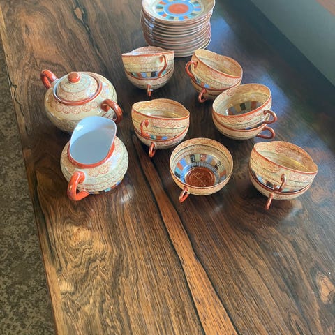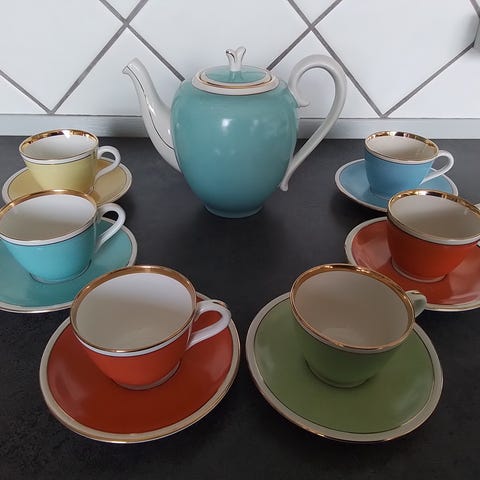 kopper, underkopper og kaffekande i flerfarvet porcelæn, rød, grøn, blå, sort og rosa.
