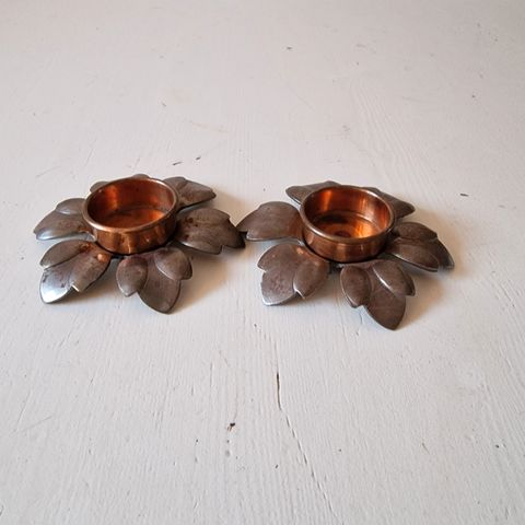 Engelske lysestager sæt i kobber/tin . Sættet består af to matchende lysestager med dekoreret fod og detaljeret udsmykning. Velegnet til almindelige stagelys og kan bruges som borddekoration eller på en reol eller vindueskarm i hjemmet.
