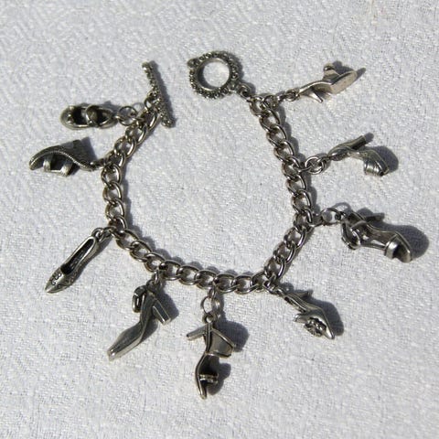 Bijouteri charmsarmbånd fra halvfemserne med 8 skønhedsrelaterede charms. Længden er 18 cm, men jeg kan muligvis forlænge det, bare spørg. Det vil være en fin gave til en frisør eller makeupartist, eller en som bare er vild med makeup og skønhed.