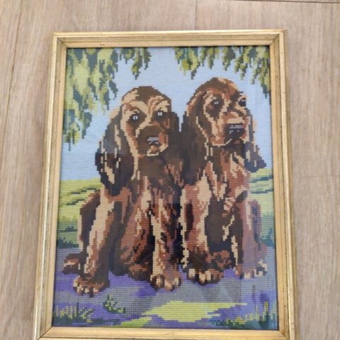 Broderet bilde i glas og ramme. 2 dejlige hundehvalpe