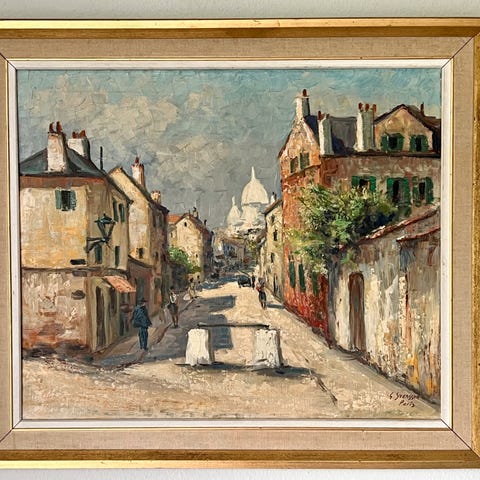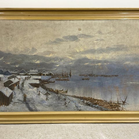 Maleri med havnemotiv, der viser både ved kaj i vinterlandskab. Motivet omfatter flere både i forgrunden, sne på dækkene og bygninger samt bro i baggrunden. Maleriet er udført i dæmpede, naturlige farver og er indrammet i en klassisk træramme med lys passepartout. Signatur ses nederst i billedet.