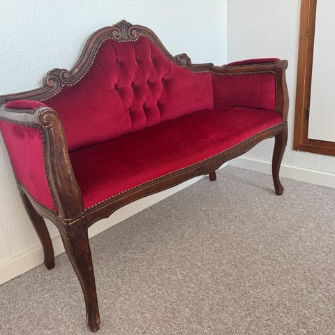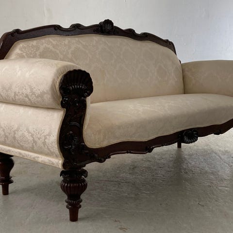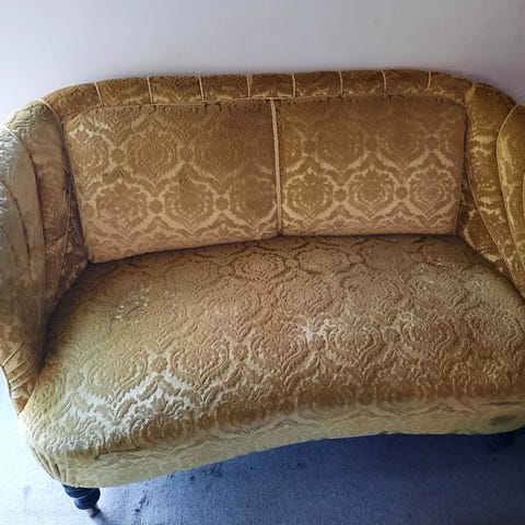 Nej jeg kender ikke historien, men jeg forestiller mig louis den 6. Har siddet til the selskab, hvor hans elsker madame Genique er stormet ind og erklæret sin kærlighed, det har skabt en masse tumult og i kampens hede er ridsen kommet på benet af sofaen. Kongens hofmand har siddet ved siden af og sikkert spildt sin the i forsøget på at afværge den mystiske kvinde, og derfor ses en mindre afskalning på armlænet.