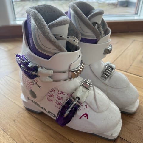 Head J2 skistøvler til børn i sort og hvid. Modellen har to justerbare spænder og hård yderskal i plast. Sålens længde er angivet til 195 mm. Velegnet som alpinstøvler til børneski med standard skibindinger.