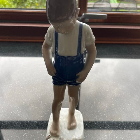 Bing & Grøndahl figur af dreng med urtepotte i glaseret porcelæn. Figuren viser en knælende dreng i blå smækbukser og lys trøje, der holder om en lille urtepotte. Undersiden er mærket med B&G-stempel og modelnummer 2127. Velegnet som dekorativ porcelænsfigur til reol, vitrineskab eller samling af danske porcelænsfigurer.