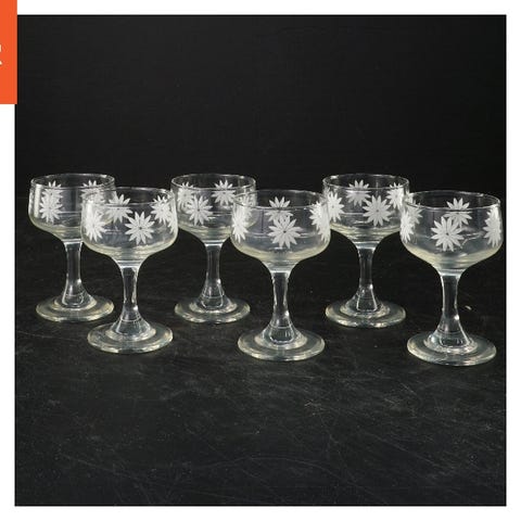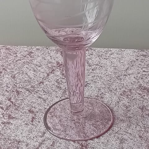Dette er et dekorativt vinglas, der måler 18 cm i højden. Glasset er lavet af gennemsigtigt materiale og har smukke, håndmalede gule blomster og grønne blade rundt omkring ydersiden og bunden, hvilket giver det et indbydende og farverigt udseende. Perfekt til at tilføje farve til borddækningen eller som en del af en dekorativ samling.