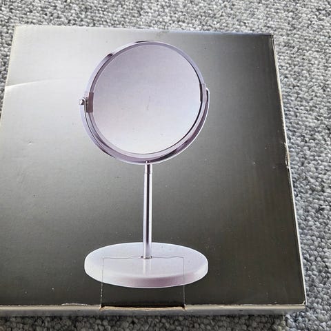 Et bordstander spejl med en rektangulær form og en metalramme. Spejlet er designet til at stå på en flad overflade, understøttet af en base. Det er justerbart i vinkel for bekvem brug. Størrelsen på spejlet er 35 cm i højden.