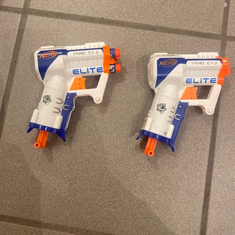 Denne genstand er en Nerf Elite Disruptor legetøjspistol, der måler 30 cm i størrelsen. Den er hovedsageligt blå, med orange tromle og detaljer samt en grå håndtag. Pistolen er designet til at affyre Nerf-dart og inkluderer en roterende tromle, der kan rumme flere dartpile ad gangen. Den har et ergonomisk greb for lettere betjening.