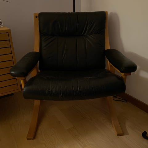 Lænestol i sort “læder” med polstret sæde, ryg og armlæn. Stolen har drejefod i lyst træ og høj ryg med støtte til nakke og skuldre. Egnet som læse- eller hvilestol i stue eller kontor.