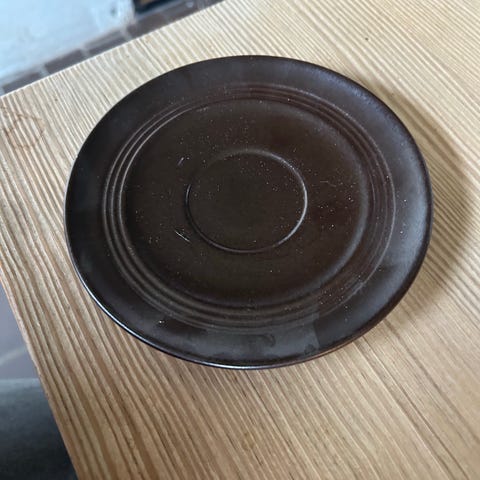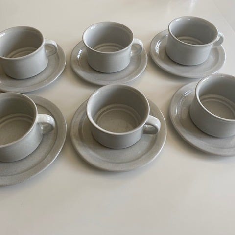 6 stk. brune kopper og underkopper i stentøj. Mærke Höganäs Party. Underkop til tekop haves også. Prisen er for alle koppe