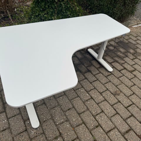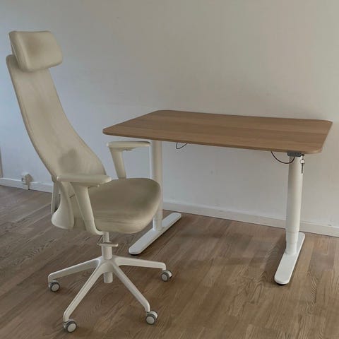 Fint IKEA hævesænkebord. Jeg malede bordpladen grøn for et par år siden, men malingen er skallet en del stedet som vist på billedet. Så trænger til en ny omgang maling.