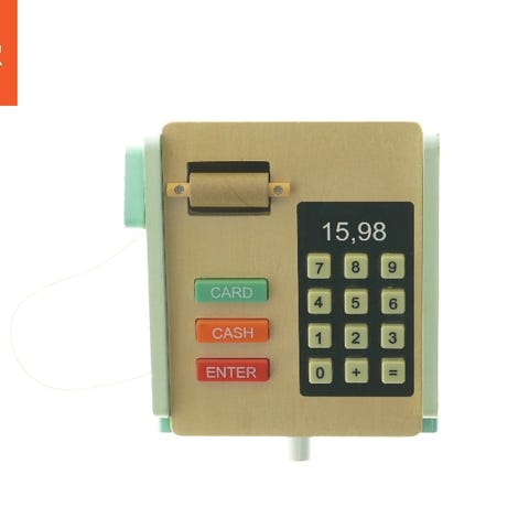 Denne legetøjslegetøjskasse, stiliseret som et McDonald's kasseapparat, er lavet af plast og har dimensionerne 11x35x18 cm. Den er primært rød og gul, med synlige McDonald's logoer og grafik på forsiden. Kasseapparatet har en række knapper og funktioner, der efterligner et rigtigt kasseapparat, herunder en skærm og en scanner med ledning.