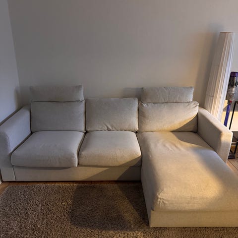 Vimle sofa fra IKEA. Består af to chaiselonger, armlæn og nakkestøtter. Ekstra betræk haves, til alle dele, farve ses på billede 3. 3D printede benforlængere til alle ben så der kan støvsuges under den. Fra røgfrit hjem med kat.