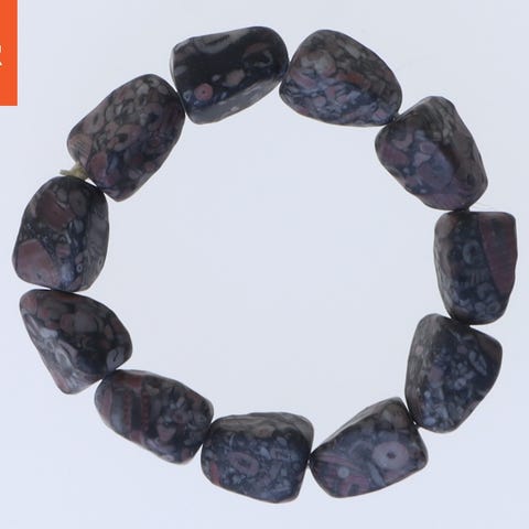 Dette er et armbånd lavet af metal og sort snor, dekoreret med en række metalperler og en stor, rund, klar sten i midten. Armbåndet har en enkel lukning og passer til en håndledsstørrelse på Ø 6 cm.