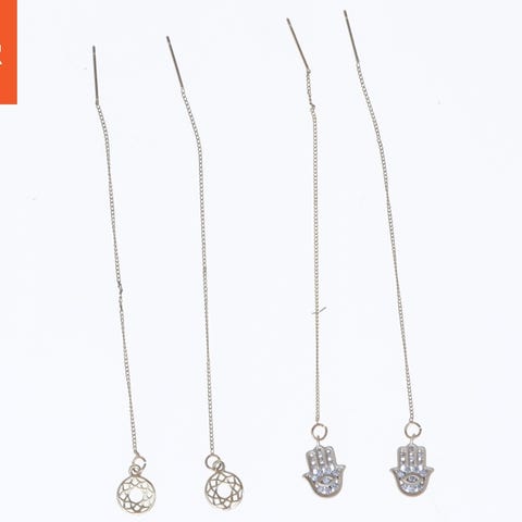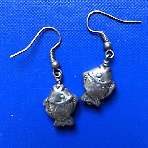 Et par øreringe formet som fiskekroge. De er lavet af metalsølvfarver og har en længde på 2,5 cm. Ørestikkerne bagpå sikrer, at de sidder godt på øret. Der er ingen tydelig branding eller mærke synligt på billederne.
