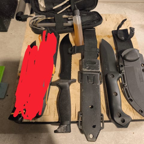 Helt nyt. Aldrig brugt. Nypris 499 kr. Dette er et Nordhunt slagtekniv-sæt, som indeholder fire forskellige knive designet til forarbejdning af vildt. Sættet inkluderer en gut hook knife (24 cm), en butcher knife (23 cm), en skinning knife (17,5 cm), og en boning knife (19,5 cm). Knivene har orange håndtag og leveres i en sort bæretaske med klips og rem, hvilket gør dem nemme at transportere. Sættet passer til jagt- og vildtforarbejdning og kan være en nyttig tilføjelse til jagtudstyr.