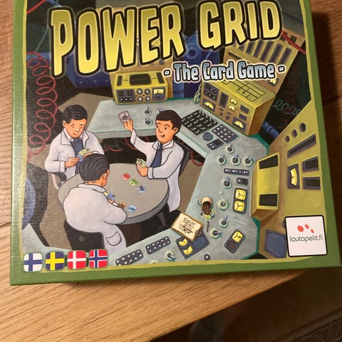 Power Grid: The Card Game is a strategic card game where players represent directors of energy companies generating electricity. The game includes 118 cards, paper currency, and game rules. Suitable for 2-6 players aged 12 and above with an approximate playtime of 60 minutes. The box displays instructions in multiple languages including Finnish, Swedish, Danish, and Norwegian.