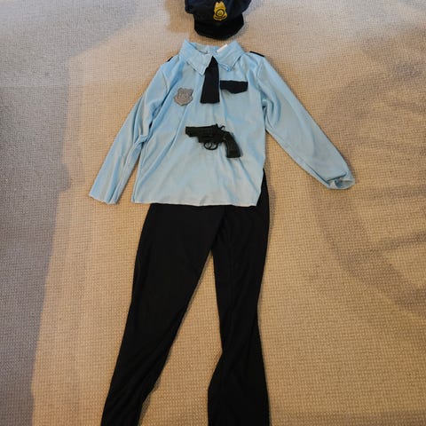 En hvid vintage politihjelm med et sort visir og et badge med en ørn på forsiden. Designet er klassisk og robust med flere metalnitter til fastgørelse af visirlåget. Hjelmen viser tegn på brug med mindre ridser og slitage på skallen. Den kan være en samlerobjekt eller bruges som dekoration.
