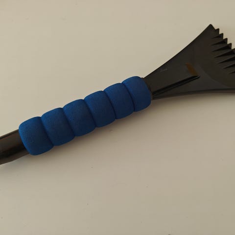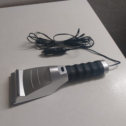 Denne elektriske isskraber er i konisk form og har en klar gul farve. Den er designet til nemt at fjerne is fra bilruder uden den manuelle anstrengelse. Skraberen kommer med en USB-ledning til opladning eller strømforsyning, hvilket gør den praktisk til brug i bilen. Den er oplagret i en blå kasse, som tydeligt angiver anvendelsen af produktet. Størrelsen er omkring 15 cm.