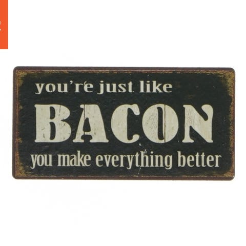 Dette er en lille metalplakat med tekst 'you're just like Bacon, you make everything better'. Plakaten er i brunlig nuance og har en retro stil. Den er designet med en lettere slidt look for æstetisk effekt. Maksimal dimensioner er 10x5 cm.