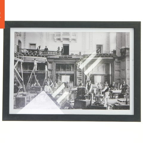 Dette er en billedramme i størrelse 21x29,7 cm, sortmalet og velegnet til indramning af fotos eller plakater. I rammen er et sort-hvid foto af arbejdere på en byggeplads, sandsynligvis taget i en ældre bygning. Bagsiden af rammen er i træfinish og er forsynet med to kroge til ophæng. Etiket på bagsiden viser mærket 'accent by nielsen'.