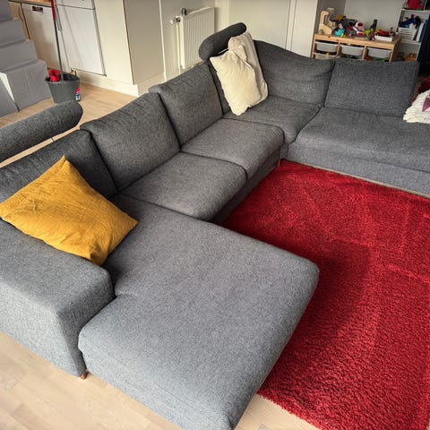 Vi sælger vores sofa da vi er flyttet. Det er en rigtig lækker flyder, rummelig og pæn. Vi er 2. Ejer. Sofaen fremstår med lidt brugsmærker, men ikke noget man ser. Den store hynde er lidt sammentrykket efter brug. Den er samlet en lille smule skævt - det kan man ændre. Det er muligt at have sofaen højre og venstre vendt. Det kræver en smule værktøj at gøre det.