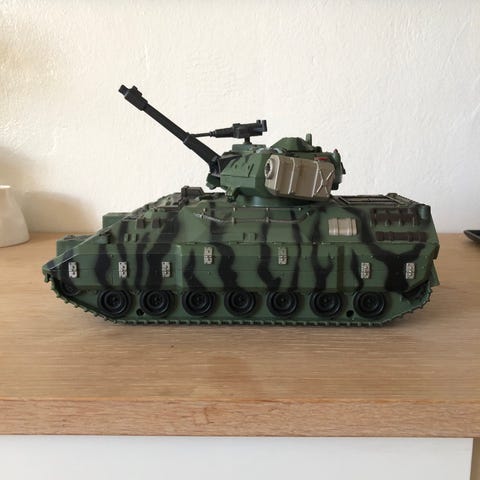 Dette er en legetøjs kampvogn i camouflagefarver. Kampvognen har realistiske detaljer såsom larvefødder, kanon og antenne. Den måler 25x15 cm, hvilket gør den til en betydelig størrelse for model- og legesæt. Designet viser dobbelt bjælker og paneler passende til militært udstyr, sammen med enkelte orange markeringslys bagpå. Det er ideelt til samlere eller børn der elsker rollespilslege med militærtema.