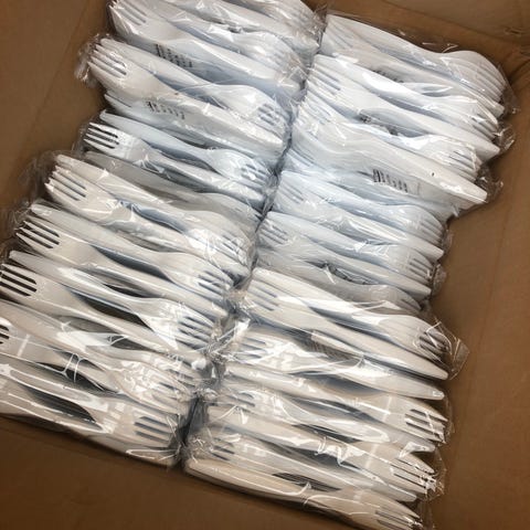 engangsbestik, plastikbestik - 100 gafler 60,- / paptallerkner/pølsebakker 50 stk. 40,- samlet pris / sender gerne