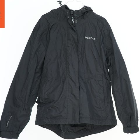 Sort vinterjakke med quiltet design, lynlås foran og hætte. Den har elastiske ribkanter ved håndleddene. Jakken er rummelig og kan beskytte mod kulde.