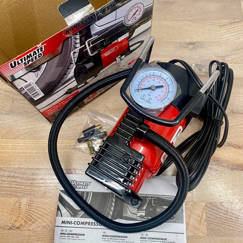 Dette er en bærbar 250 PSI luftkompressor, ideel til hurtigt og nemt oppumpning af dæk og andre små genstande. Den er elektrisk drevet og har en indbygget trykmåler, der gør det nemt at overvåge trykniveauet. Kompressoren er kompakt og har en praktisk størrelse på 15x13 cm, hvilket gør den let at transportere og opbevare. Den leveres også med en strømkabel og slange til tilslutning.