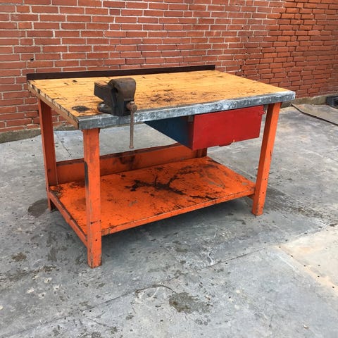 Stort set ubrugt filebænk/arbejdsbord med skuffe og hylde. Medfølger også en skruestik samt værktøjsholder.