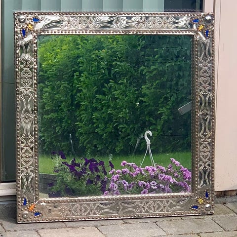 Et par dekorative spejlrammer med en elegant, detaljeret guld-look design. Rammen har et integreret krog i bunden, hvilket gør den ideel til ophængning af lette genstande. Begge spejle har en rektangulær form med prydende kantdetaljer, der giver dem en antik stil. Bagsiden er dækket med en kartonplade, der holder spejlet på plads. Størrelsen på hvert spejl er 28,5x16,5 cm.