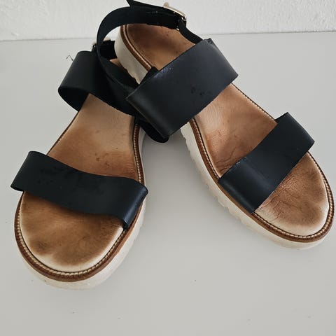 Par sorte sandaler med en bred rem og en dekorativ metalspænde på toppen. Remmen er solid og designet til at give en sikker hold omkring foden. Sandalerne har en stødabsorberende sål, der tilbyder ekstra komfort. Disse sandaler er i en størrelse 42.